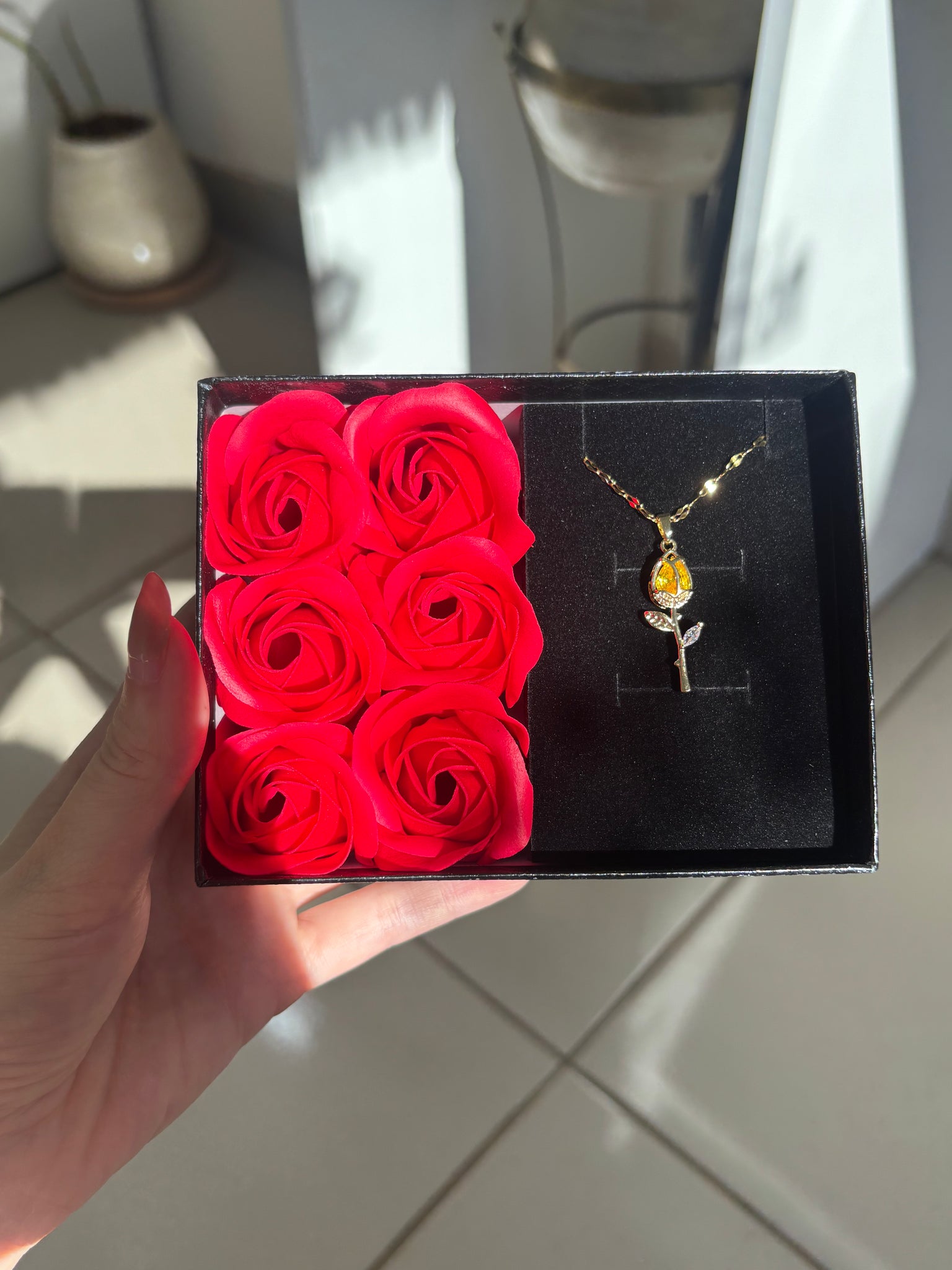 Regalá un símbolo de belleza infinita. Un collar delicado presentado en una caja de flores que se mantienen perfectas para siempre.