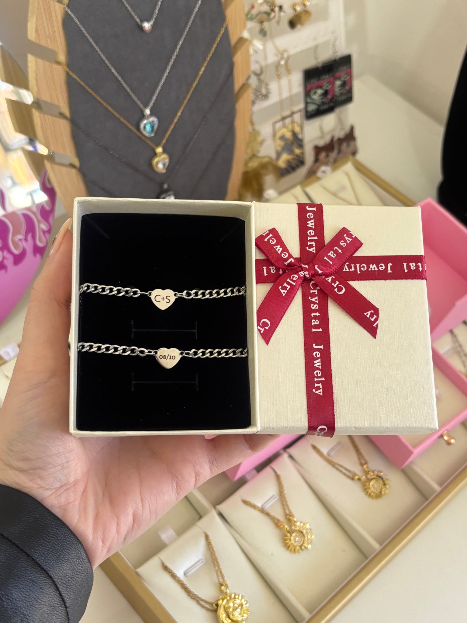 Este set de pulseras de pareja en acero inoxidable es el detalle ideal para quienes quieren llevar un pedacito del otro siempre cerca.