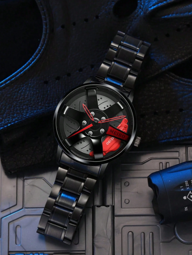 Su caja presenta un diseño audaz que simula un disco de freno y un calibrador rojo, capturando la adrenalina de la pista. Con correa y caja de metal resistente en color negro, este reloj es una declaración de estilo y pasión por la ingeniería y la velocidad.